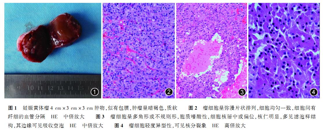 妊娠黄体瘤肿物呈多结节状或分叶状, 类圆形或圆形,淡黄、灰棕或黄褐色,边界清楚,无包膜或似有不完整包膜。大小悬殊较大,直径6~8cm多见。 切面实性质软,细腻,有实性为主伴囊性区或暗红色出血区。 另有报道肿瘤呈多房囊性,内含血性液体,产后可消退,质软、苍白,常有坏死。 瘤细胞大小较一致,大多数呈实性片状或弥漫分布,或围绕成似滤泡样腔隙,腔隙内含有嗜酸性胶样物质,偶见排列成条索状或小梁状。 间质为纤细的纤维结缔组织及血管分隔。瘤细胞呈多角形或不规则形,大小介于颗粒细胞及卵泡膜黄体细胞之间。 胞质嗜酸性,不含或含脂质。 胞核居中或偏位,中等大小,圆形,核仁明显,染色质疏松,可见轻度多形性,核分裂象平均(2~3)/10HPF。 有时胞质气球样变明显,类似妊娠黄体细胞的细胞质内玻璃样小滴或有微小空泡。 残留的卵巢可见正常的妊娠改变,如妊娠黄体及颗粒细胞增生。 本组可见结节性卵泡膜黄素化细胞增生,符合这一特点。 免疫组织化学与黄体细胞和卵泡膜细胞的表型相似,在肿瘤的鉴别诊断中不起关键作用。 肿瘤细胞α-抑制素、波形蛋白、CD99弥漫阳性、calretinin局灶阳性。 本组病例细胞Ki-67 阳性指数较低,S-100蛋白阴性,表明细胞内没有脂质,并非类固醇肿瘤。