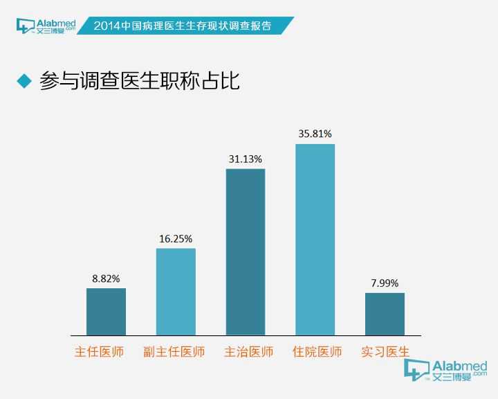 主任医师/主任技师8.82%、副主任医师/副主任技师16.25%、主治医师/主管技师31.13%、住院医师/技师35.81%、实习医生/实习技师7.99%;