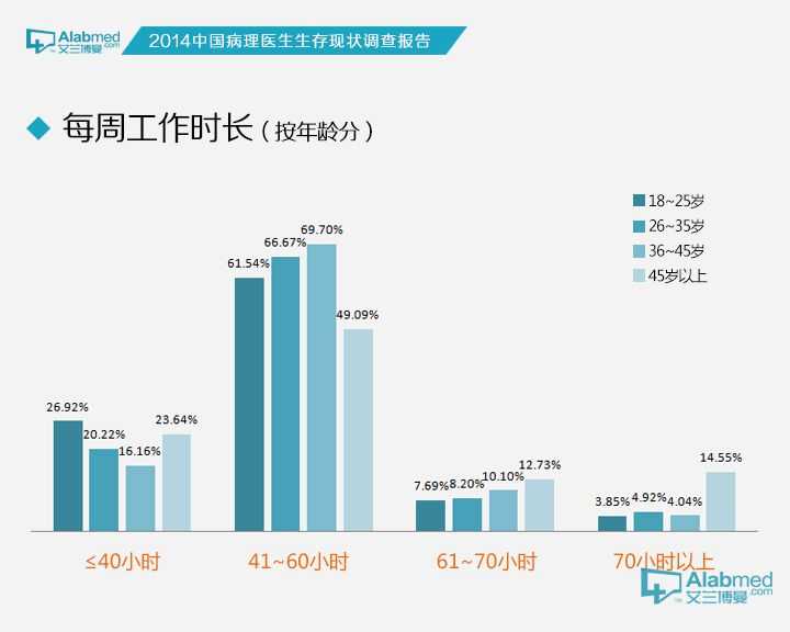 病理科医生每周累计工作多长时间呢?统计数据显示,64.46%的病理科医生每周工作时长介于41~60小时,每周工作时长不超过40小时,61~70小时,70小时以上的病理医生分别为20.11%,9.37%和6.06%,总体而言病理科医生偶有加班。比较有意思的一个现象是, 在为数不多的每周工作时长超过70小时的病理科医生中,随着年龄的增长45岁以上的医生相对其他年龄段的医生而言所占百分比更大。上述数据与按照职称分类的结果相似。